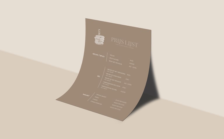 Alongside the logo, we designed supporting elements such as the price list and business cards, all aligned within the same visual direction. The result is a cohesive identity that feels calm, feminine, and professional, perfectly capturing the essence of Mo’s Nailart.